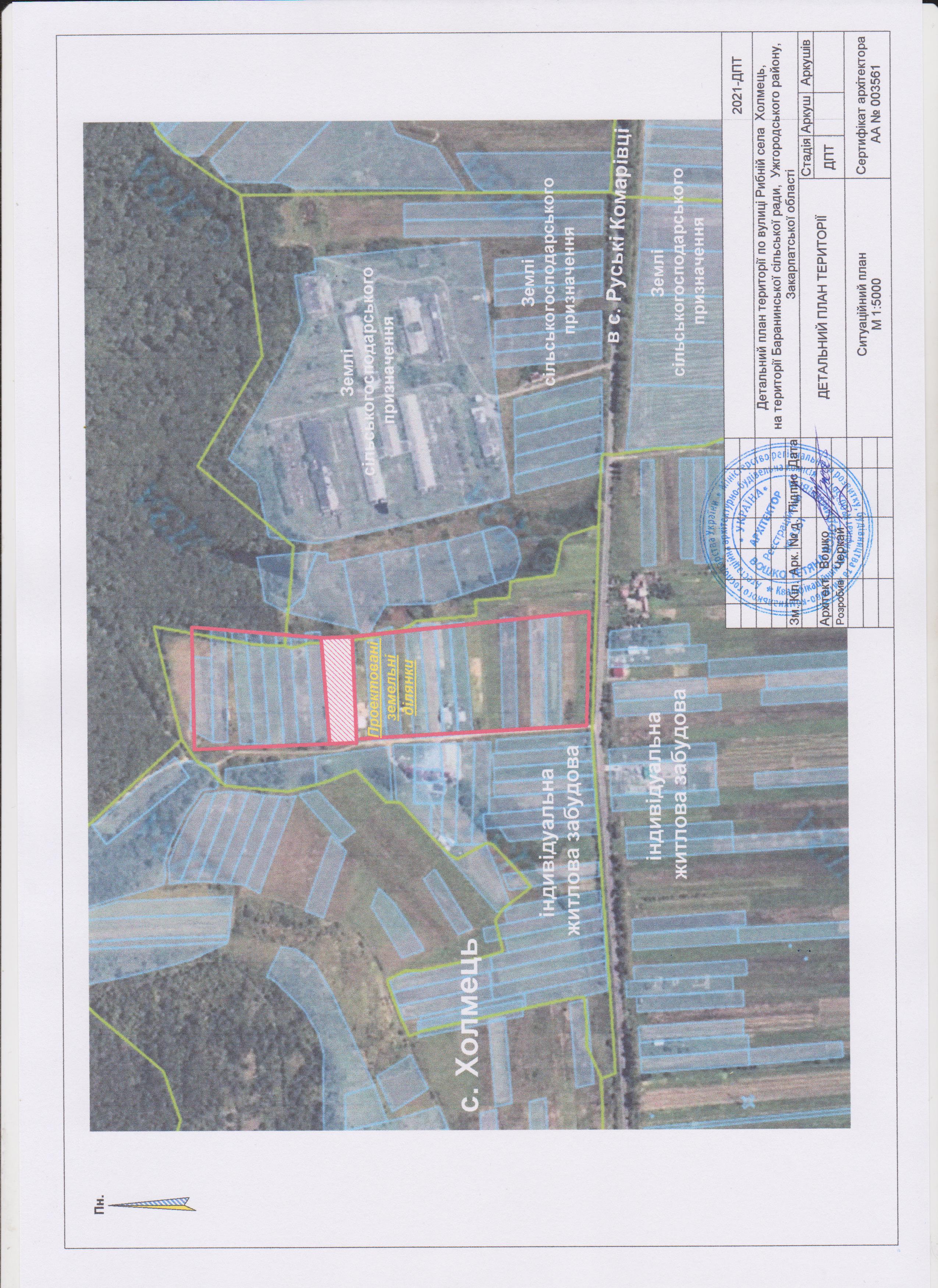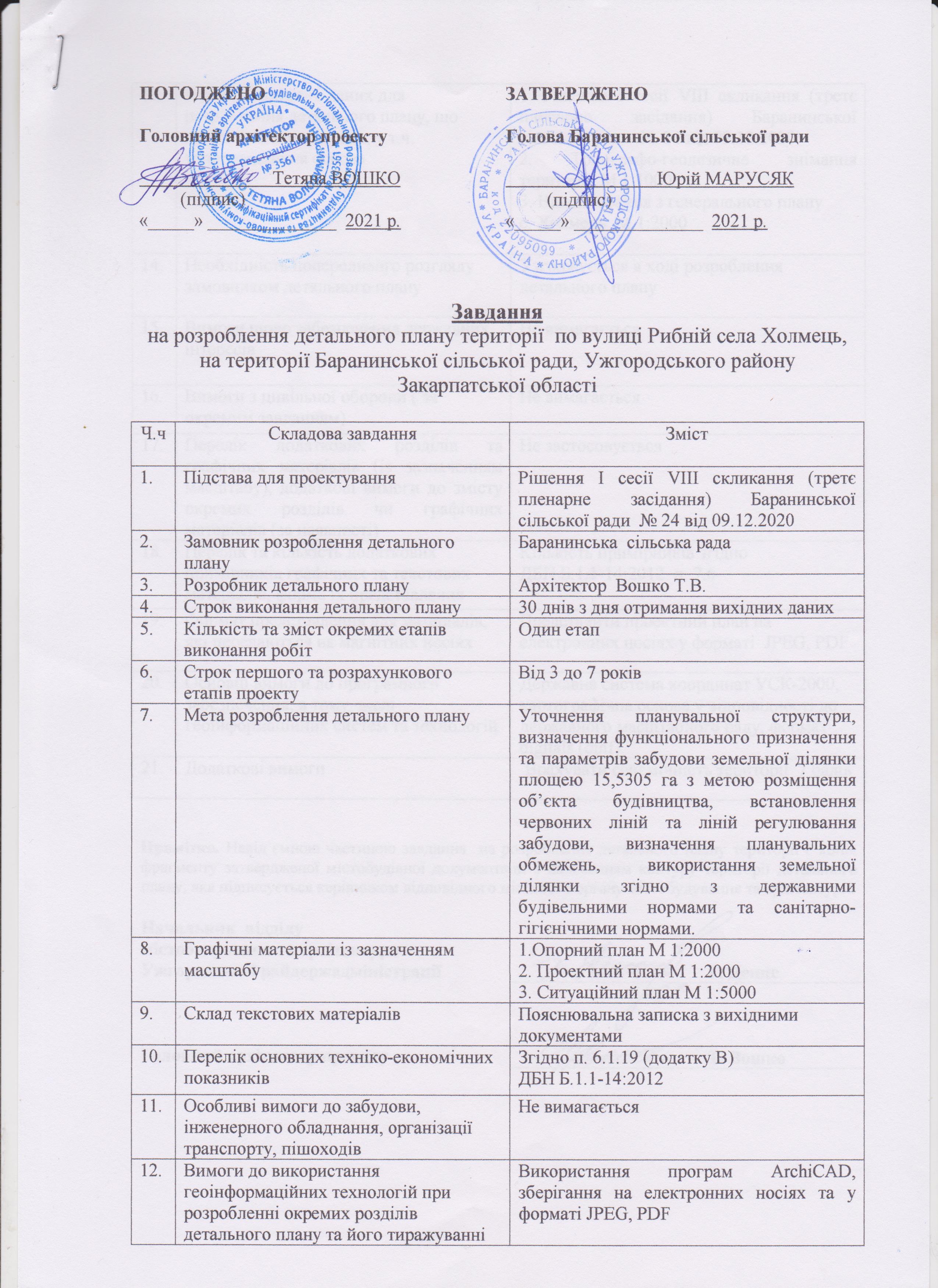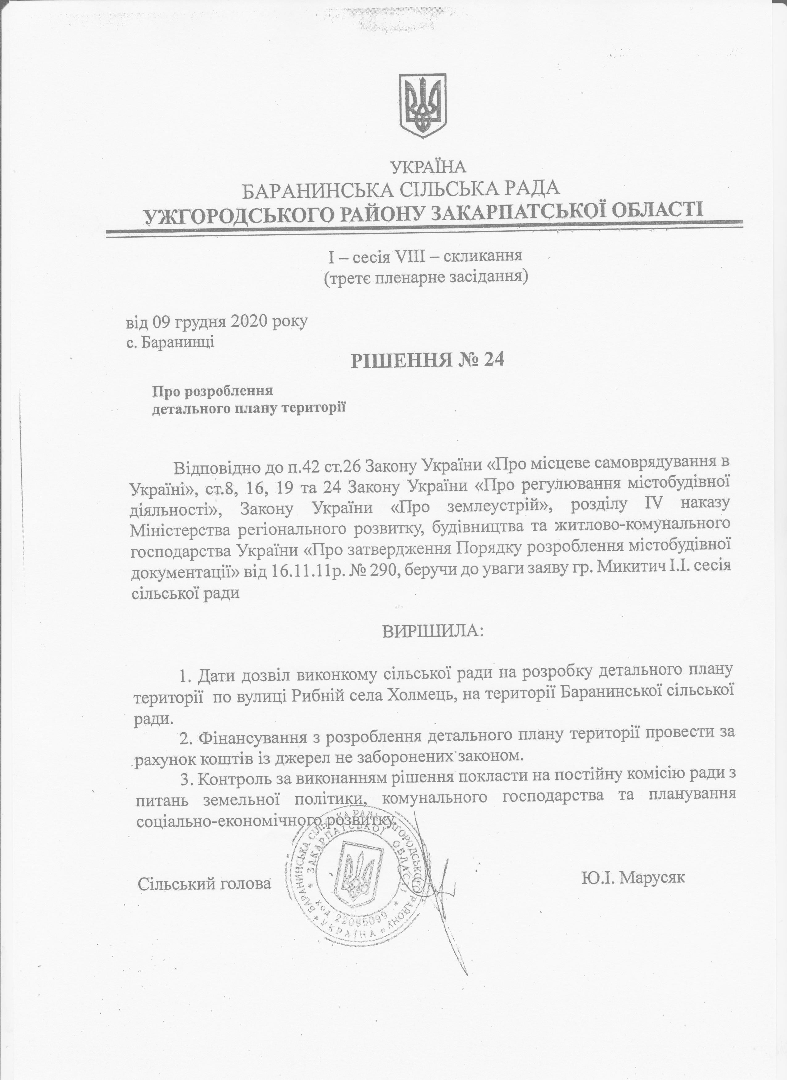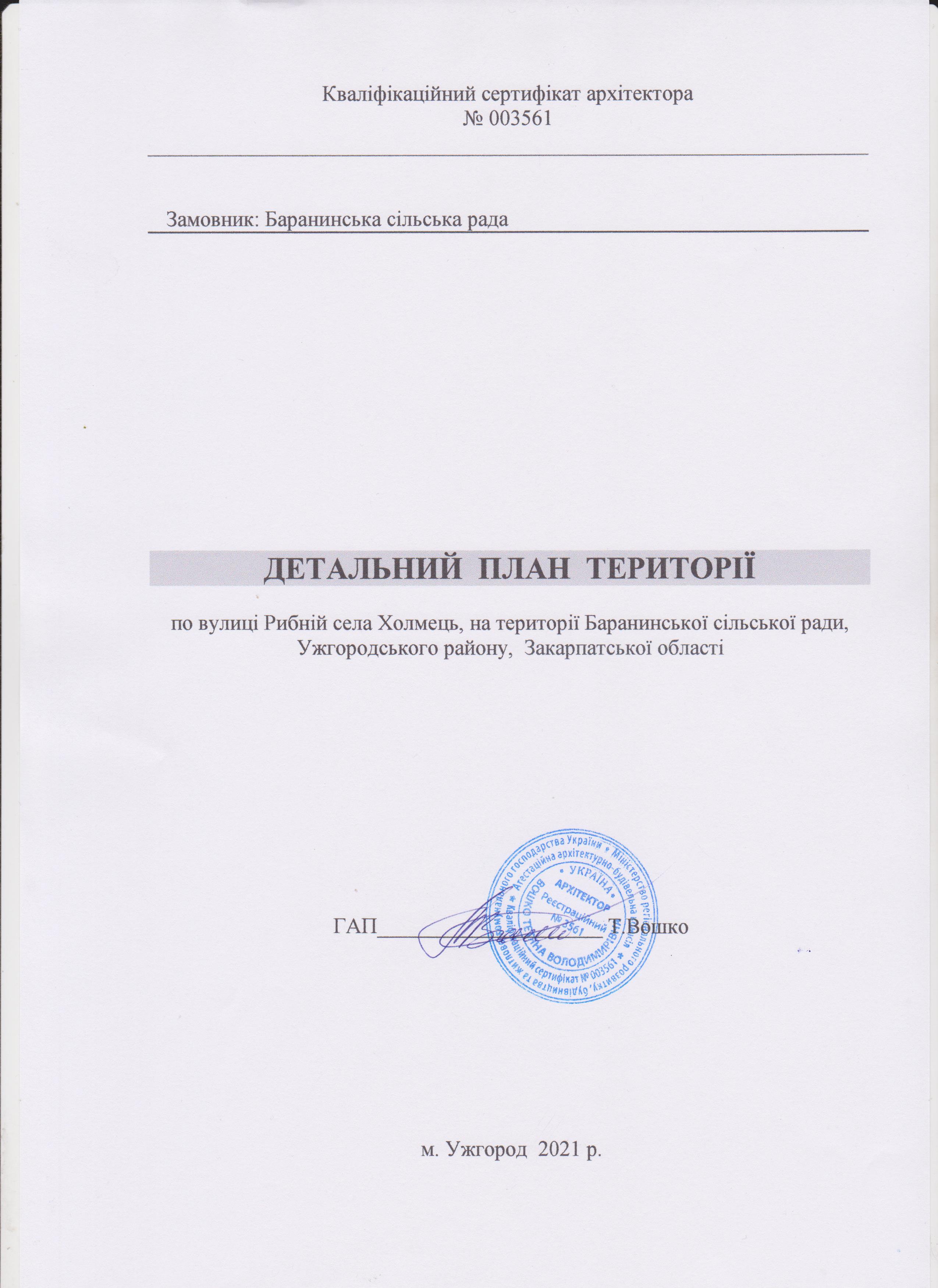 Проект детального плану території земельної ділянки під житлову забудову «Детальний план території ділянки по вулиці Рибній села Холмець, на території Баранинської сільської ради, Ужгородського району, Закарпатської області» виконано на підставі рішення першої сесії сьомого скликання (третє пленарне засідання) Баранинської сільської ради від 09.12.2020 № 24 на основі завдання на проектування розробленого у відповідності до ДБН Б.1.1- 14:2012 «Склад та зміст детального плану території».