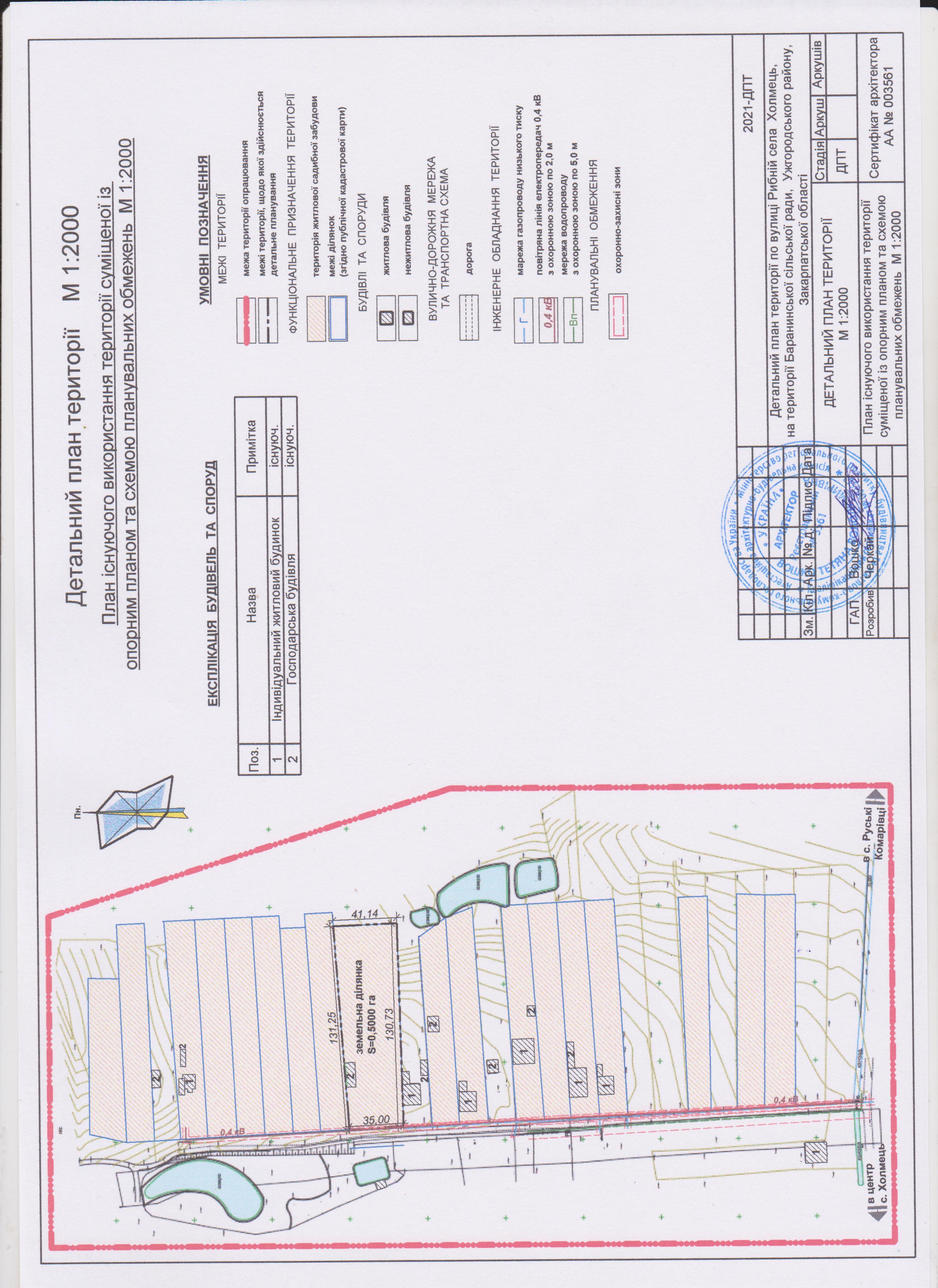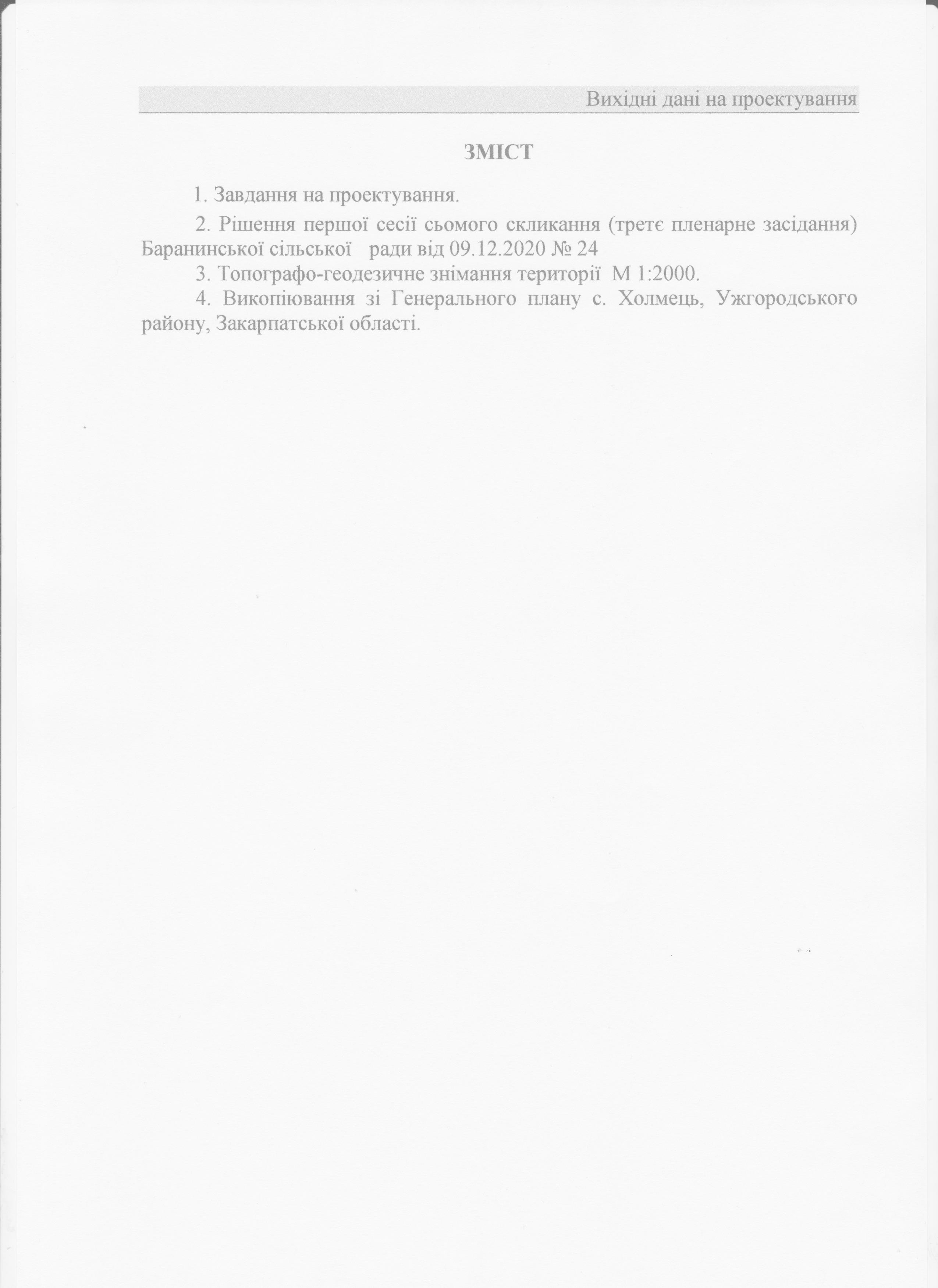 При розробці, були використані такі матеріали: - дані Баранинської сільської ради; - Генеральний план с. Холмець, Ужгородського району, Закарпатської області; - план меж земельних ділянок; - план топографічного знімання М 1:2000 (додається); - натурне обстеження території детального планування. Розроблення проекту детального планування виникло у зв’язку із такими змінами: - реалізація положень Генерального плану с. Холмець; - нові діючі нормативні документи містобудівної політики; - вирішення концепції перспективного розвитку проектованої та прилеглих територій з визначенням чіткого зонування; - наміри замовника.