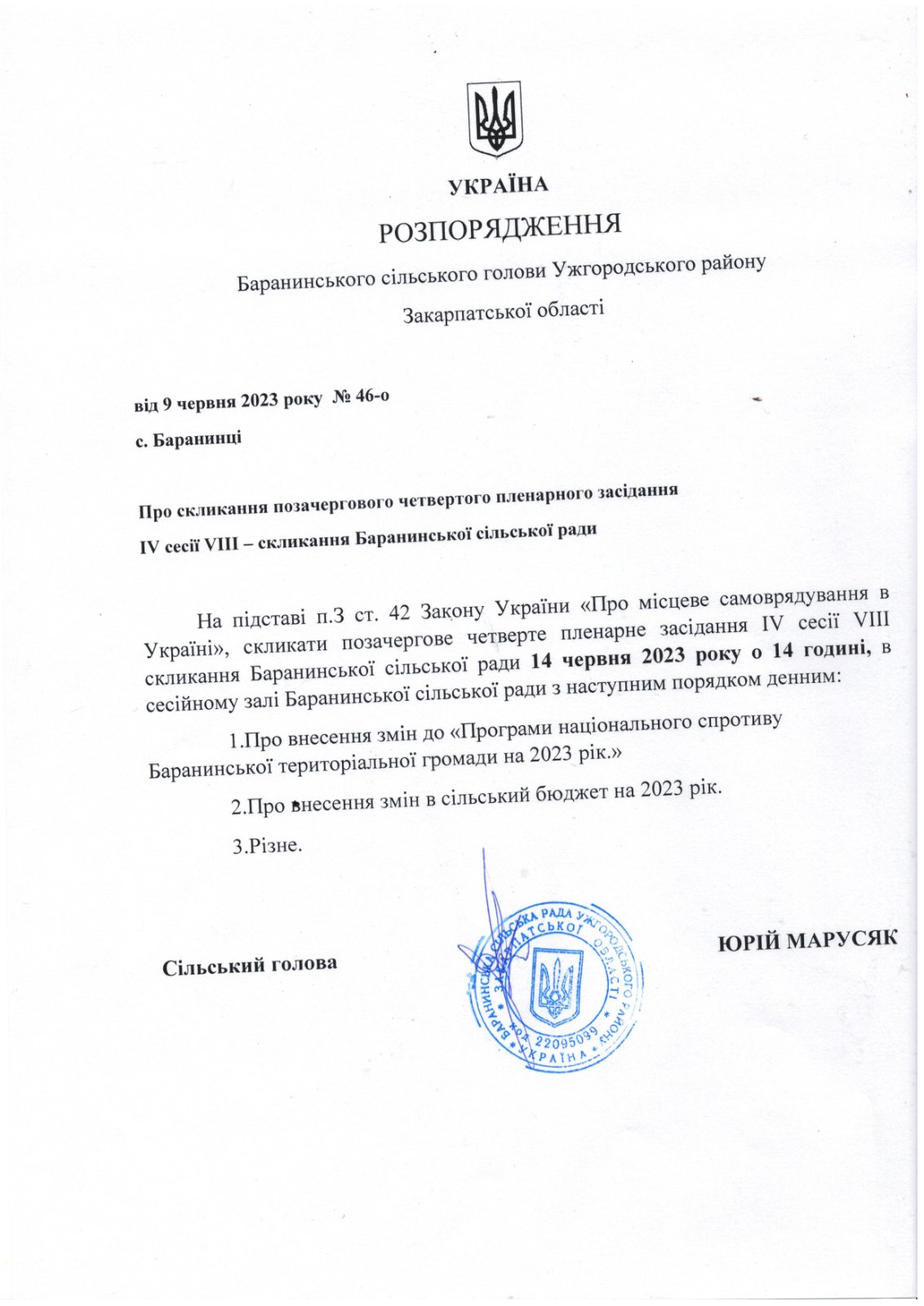 На підставі п.З ст. 42 Закону України «Про місцеве самоврядування в Україні», скликати позачергове четверте пленарне засідання IV сесії VIII скликання Баранинської сільської ради 14 червня 2023 року о 14 годині.