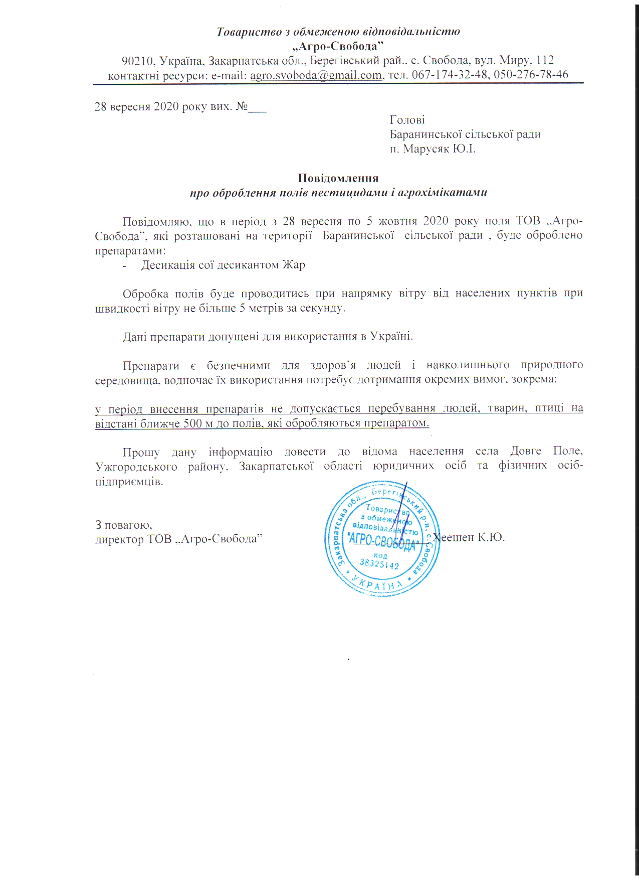 З повагою, директор ТОВ „Агро-Свобода”