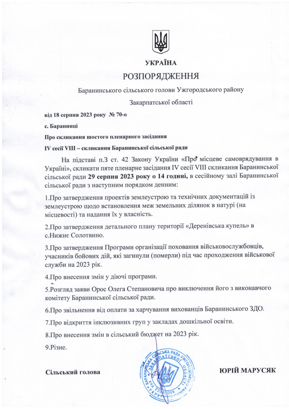 На підставі п.З ст. 42 Закону України «Про місцеве самоврядування в Україні», скликати пяте пленарне засідання IV сесії VIII скликання Баранинської сільської ради 29 серпня 2023 року о 14 годині, в сесійному залі Баранинської сільської ради.